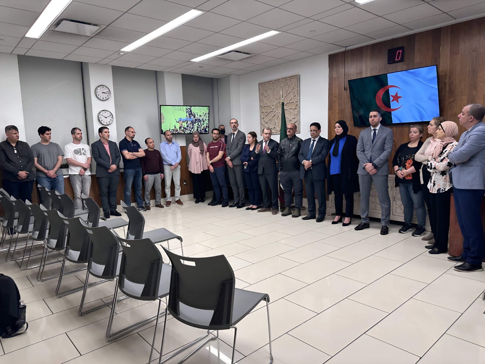 After listening to the national anthem, reciting of El Fatiha and observing a minute of silence, the Consul General delivered a speech explaining the intended purpose of commemorating this day in Algeria and reminding of the struggle and sacrifices of the Algerian people to free themselves from the yoke of colonialism. A struggle that has not ceased or waned since the colonizer set foot on Algerian soil until it was expelled 132 years later. Also, he made, during his speech, a comparison between the struggle of our people and the resistance of the Palestinian people, especially the populations of Gaza who are facing genocide by the Zionist entity.